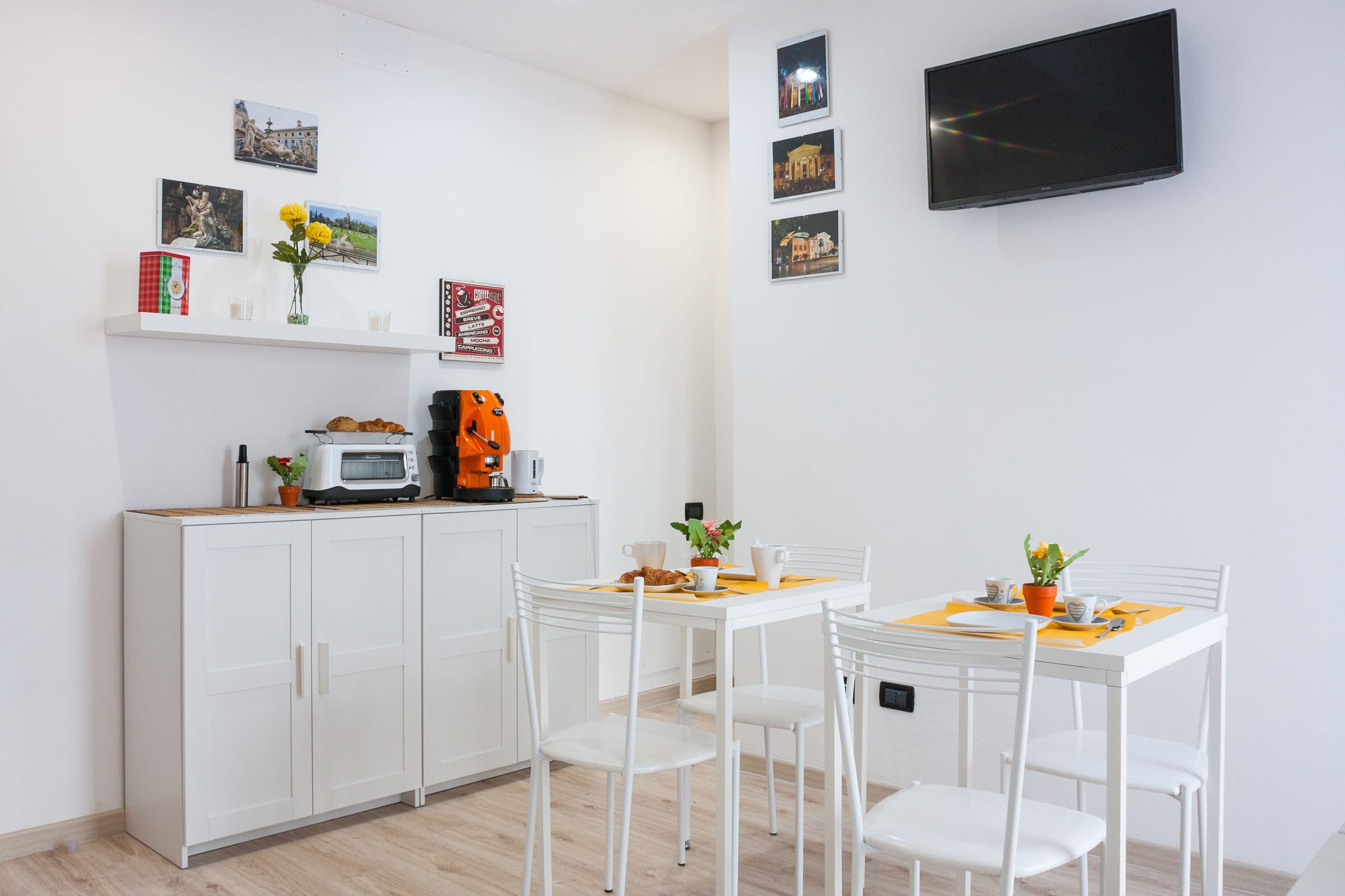 There is a perfectly working kitchen with magnetic induction hobs. A very bright breakfast room is available to guests during breakfast time.